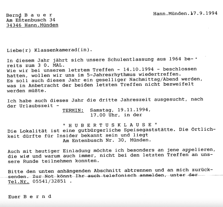 Unser drittes Treffen der Abschlussklasse 10 B fand auf Einladung von Bernd am 14. Oktober 1994 in Hann. Münden am Entenbusch im Restaurant „Hubertusklause“ Inh. Willi Bodmann († 2016) statt.